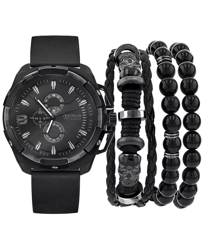 American Exchange Men's Black Polyurethane Strap Watch 40Mm Gift Set