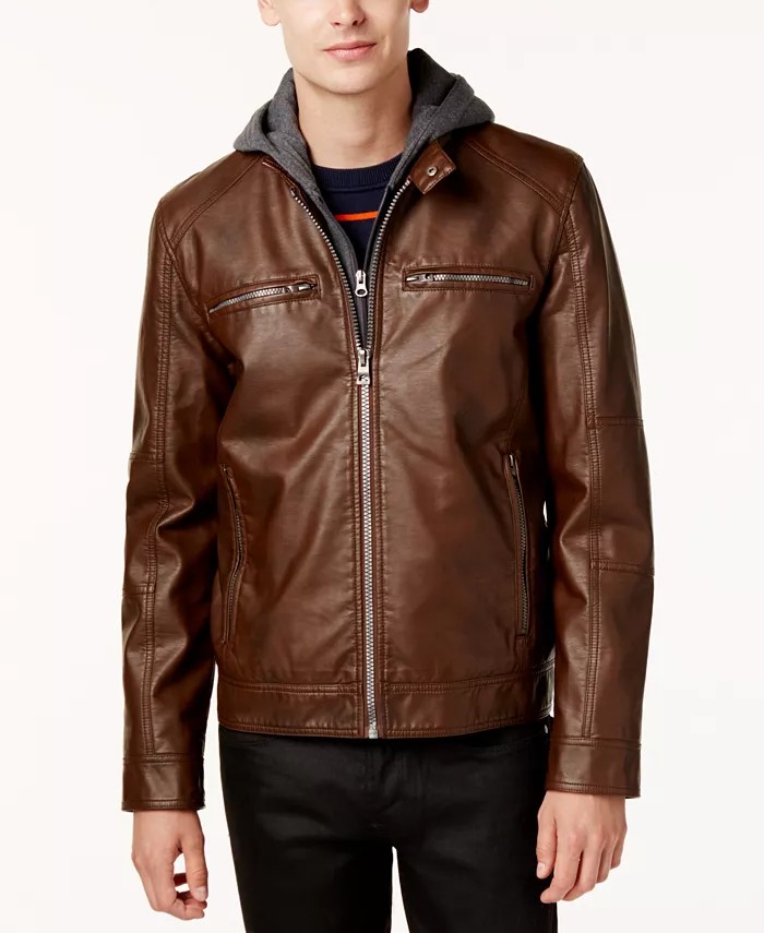 GUESS Men's Faux-Leather Detachable-Hood Motorcycle Jacket