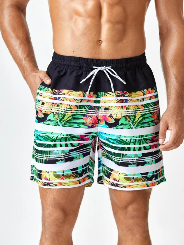 SEN Men Tropical And Striped Drawstring Swim Trunks