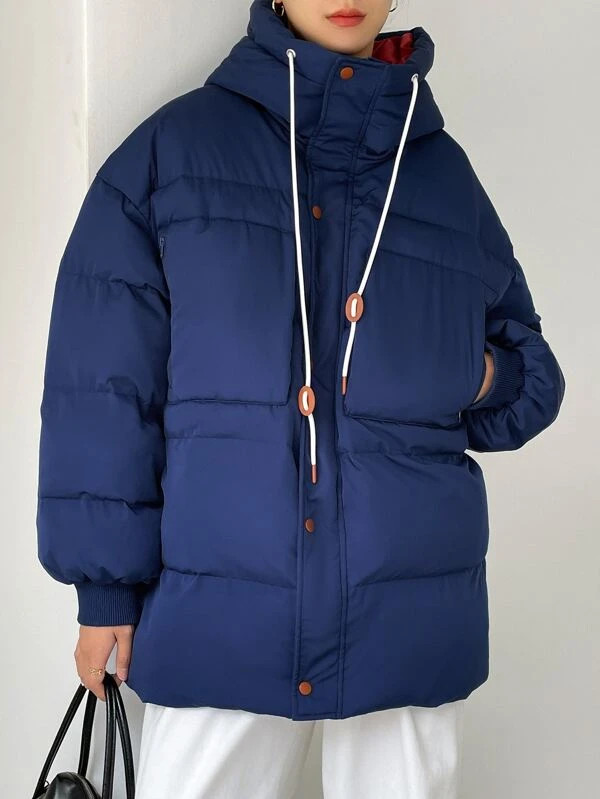 SEN DAZY Drop Shoulder Drawstring Zipper Hooded Puffer Coat