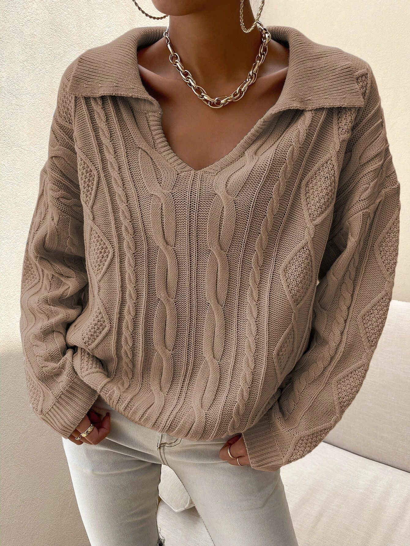 Shein V-neck Collared Cable Knit Sweater