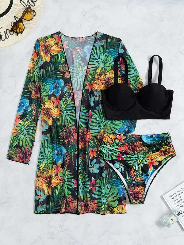 SEN 3pack Tropical Print Push Up High Waisted Bikini Swimsuit & Kimono