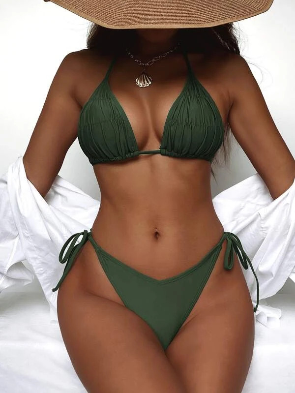 SEN Ruched Halter Tie Side Bikini Swimsuit