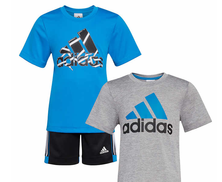 Solid blue tee with black adidas logo on chest featuring shoe lace design over logo